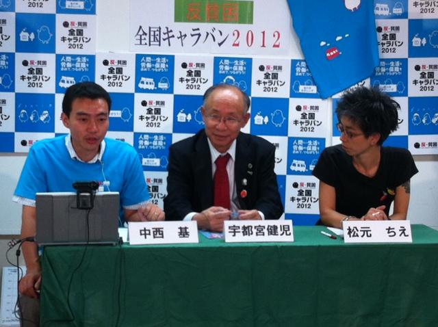 7 月14日北海道・釧路から「反貧困全国キャラバン」がスタートした。この日の午後、東京・新宿のスタジオでは「キャラバンTV・3時間生中継」が放送され た。ゲストは宇都宮健児さん(中央)。「17人に1人が生活保護」という釧路の実態をはじめ、スカイプで、北海道・埼玉・愛知・滋賀・岐阜・三重・福岡・ 沖縄の各地から生の声が寄せられた。第2部の「反貧困クイズ」は爆笑の連続だったが、「OECD加盟国で日本の貧困率は第4位」「先進国で賃金が下がり続