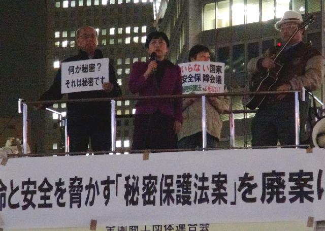 「秘 密保護法反対」の一点で21日に日比谷大集会を計画している「11.21実行委員会」のメンバーら150人が、11月14日東京・新宿西口で大宣伝行動を 展開した。街宣車に上がった福島みずほ議員(同法特別委員会委員・写真)は、道行く人たちに呼びかける。「私は防衛秘密なんか関係ない、それは公務員の問 題、と思ったらとんでもないです。民間企業で働く人も派遣で働くひとも、みんな芋づる式でターゲットになるのです。外国人に友人はいないか、飲酒クセはな いか、ブログで何を発信しているか、すべて調べられる。そういう法律です。安心してお酒飲んでられないですよ。そもそも情報は国民のもの。私は国会で暴れ ます。一緒に廃案に追い込みましょう」。チラシの受け取りもいつもより間違いなくよかった。(M)