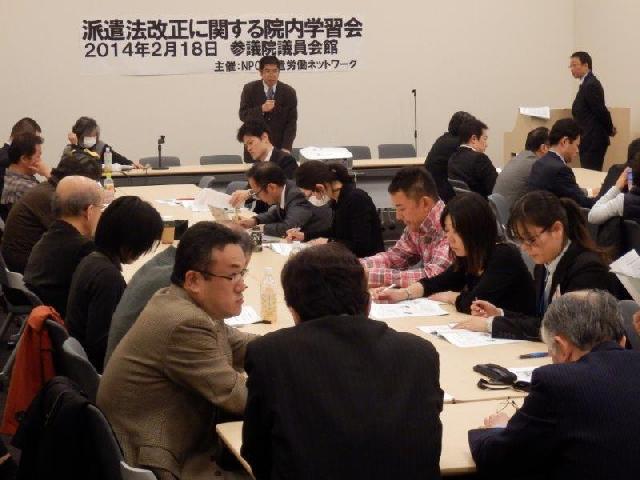 派 遣3年入替制・有期雇用10年特例・ジョブ型正社員・労働時間規制見直しなどアベノリスク雇用政策が相次いで打ち出されつつある中、国会での論戦が始まっ た。こうした中、NPO派遣労働ネットワーク(理事長:中野麻美弁護士)が主催し2月18日(火)11時から参議院議員会館で「派遣法改正を考える院内学 習会」を開催した。中野理事長が「派遣法改正建議を問う~派遣労働者の生活と権利は向上するのか」のメイン報告。伊藤連合雇用法制対策局局長が労政審議会 の経緯、関根派遣ユニオン書記長が派遣スタッフアンケートの内容を紹介した。3名の派遣労働者が発言(パルシステム雇止め・原発偽装請負・日雇派遣の現 状)、学習会終了後は報道関係者に囲まれた。(関口達矢)