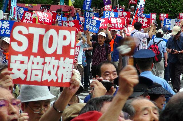 organizer placed around the Diet building. “No war legislation!””Resign, Abe!”