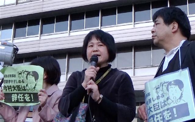自主避難者や市民が復興庁前で、国の無策と責任放棄を追及した。 森松明希子さん