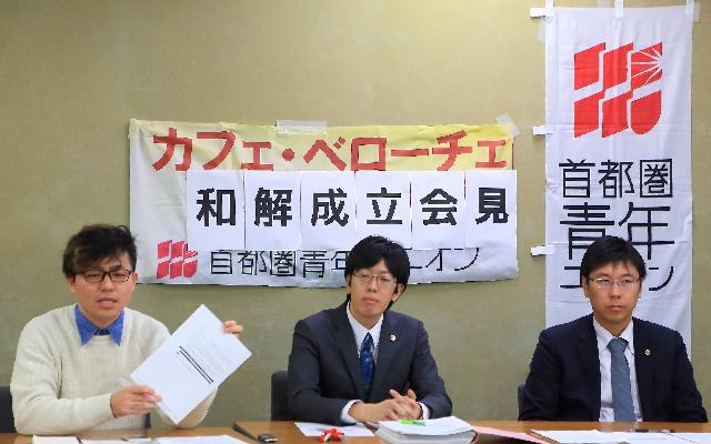 2 月16日、カフェ・ベローチェ4年雇い止め事件が東京高裁で和解成立した。首都圏青年ユニオンは「勝利和解」として声明を発表した。以下声明か ら。…2016年2月16日、東京高等裁判所民事第5部において、「カフェ・ベローチェ」を運営する株式会社シャノアールが、同千葉店で足かけ9年にわ たって、アルバイトとして勤務してきた女性労働者(控訴人)を、雇止めした事件において、和解が成立した。2、裁判上の和解の内容に従い、和解の内容を下 記のとおり発表する。今般の和解は、控訴人が理不尽に職を奪われたのち、地裁判決で不利な立場に立たされた控訴人と組合にとって、高裁の裁判官が、原審の 判断に疑問を呈したうえで提案した内容を元に進められた和解協議の末得られたものである。内容的にも、解決金が得られたこと等から、組合は、勝利和解と評 価している。 詳細 *写真=和解成立を発表する記者会見